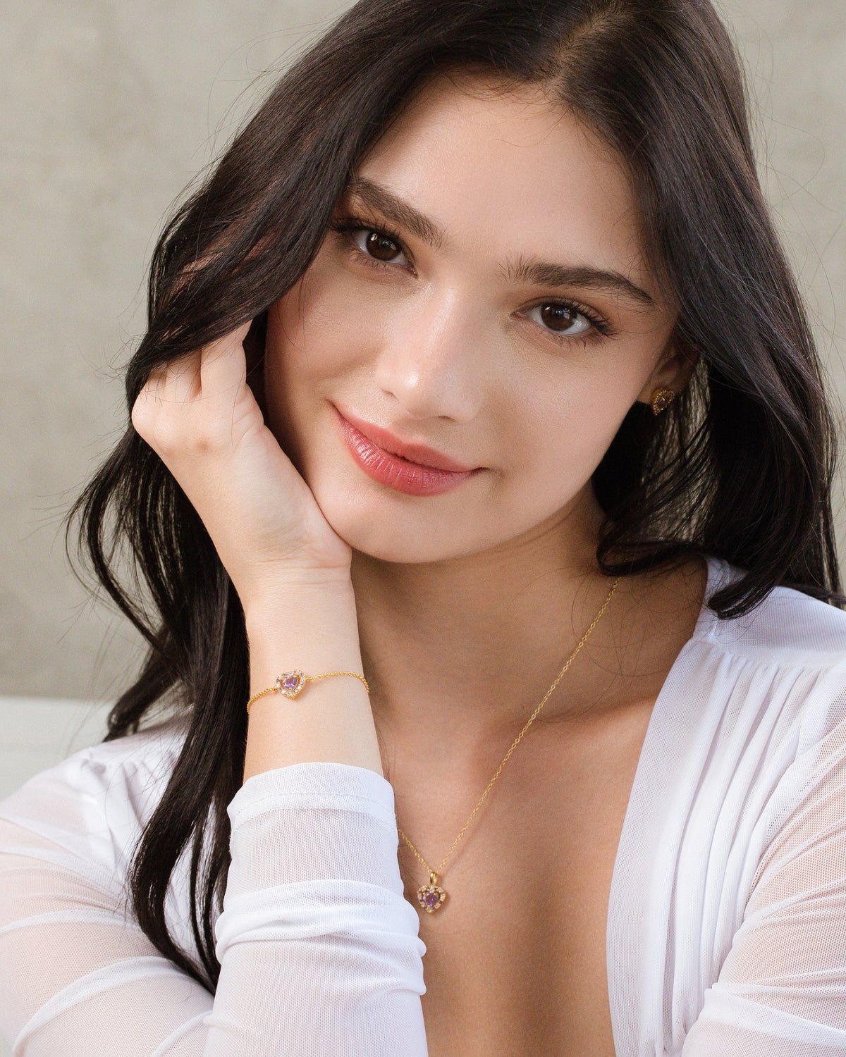Say 'I love you' with this stunning heart gift set. This jewellery set comprises a pendant necklace, a bracelet and a pair of stud earrings, making it the perfect valentine's gift, birthday gift and anniversary gift for your loved ones. Handcrafted in a unique double heart design, the gift set features stunning heart-shaped lavender amethysts in the centre and adorned the second layer of heart, made with lavender amethyst and simulated diamonds.
