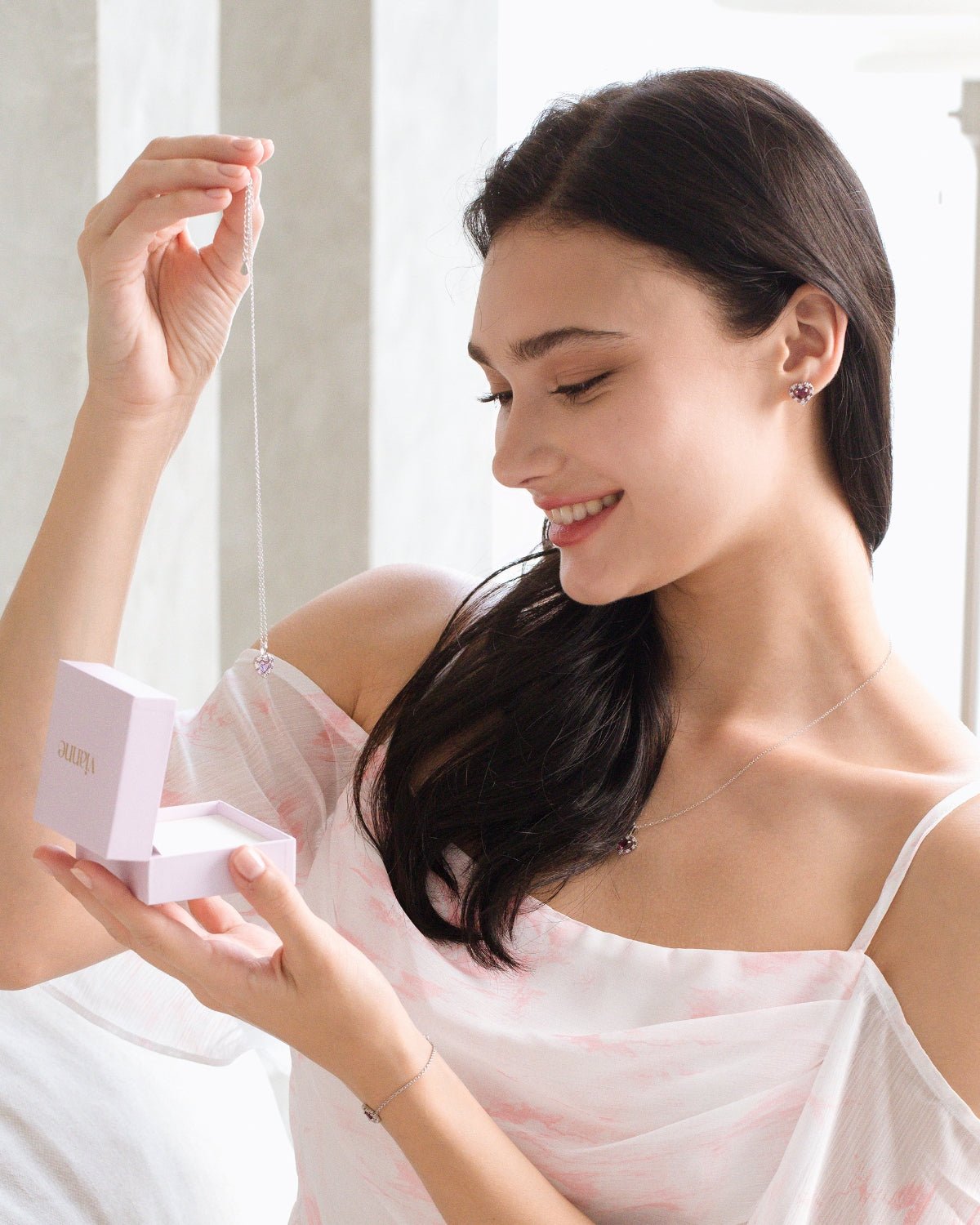 This beautiful bracelet will make your heart flutter. Crafted in a unique double heart design, the bracelet features a heart-shaped rhodolite garnet - the stunning raspberry red gemstone in the centre and adorned the second layer of heart, made with pink rhodolites and simulated diamonds.